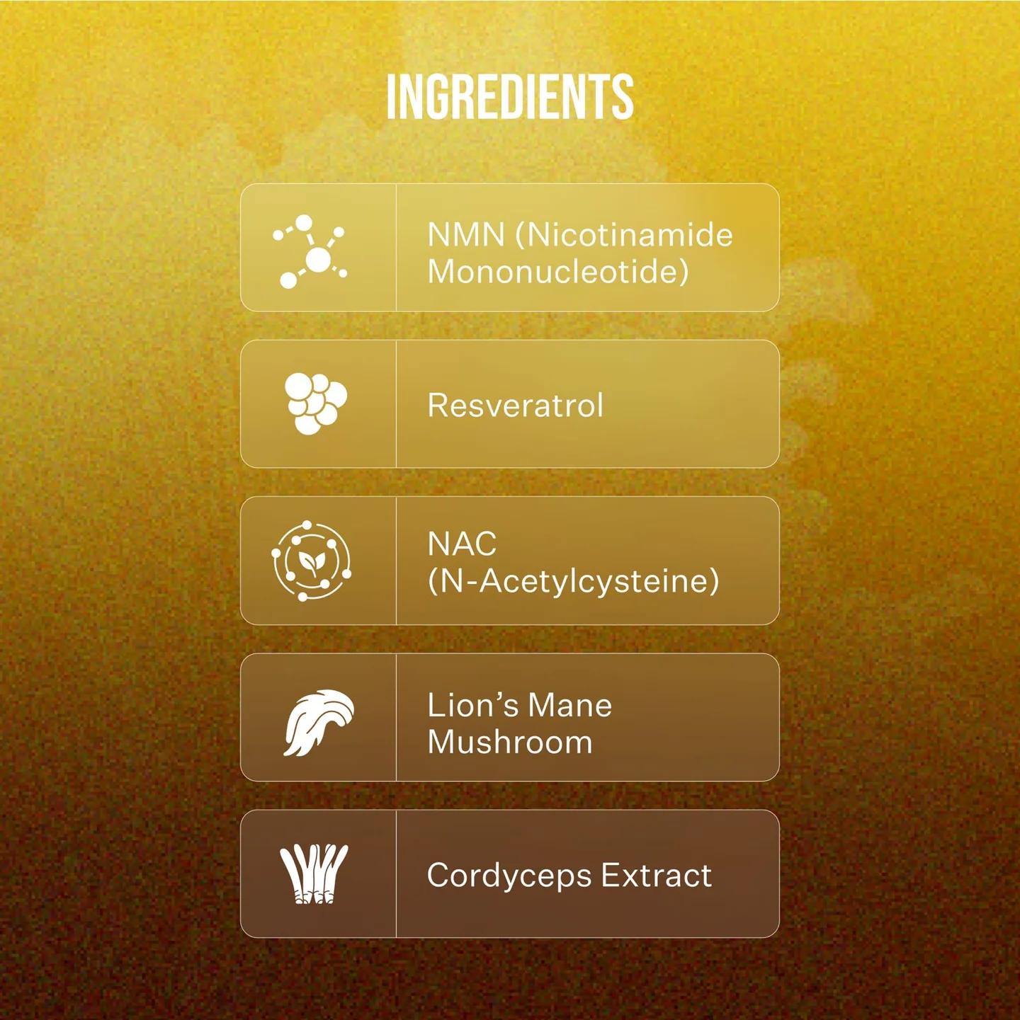 מסייע להעלאת רמות NAD+, תומך באנרגיה תאית, תיקון תאים ותהליכי חיות לאורך זמן.